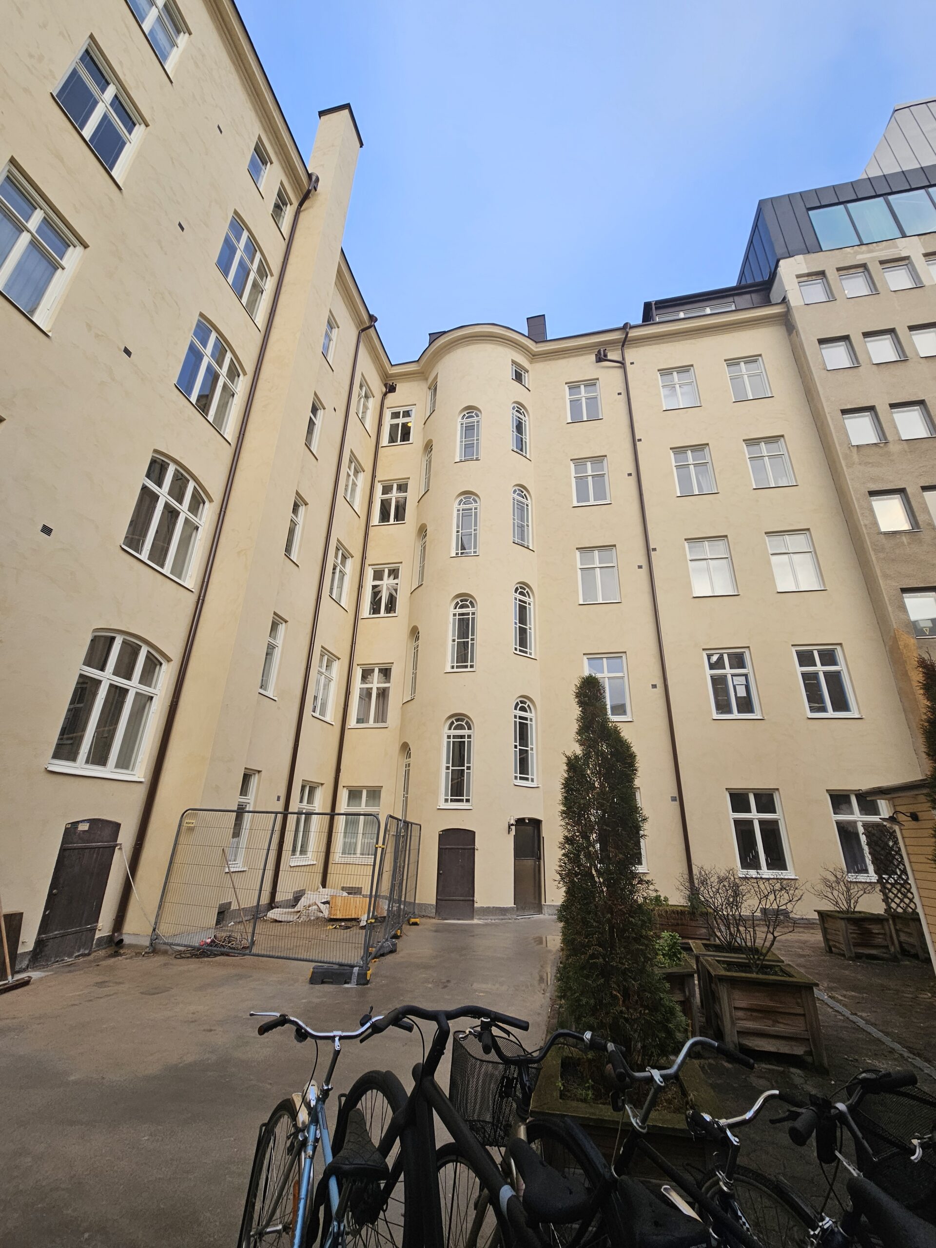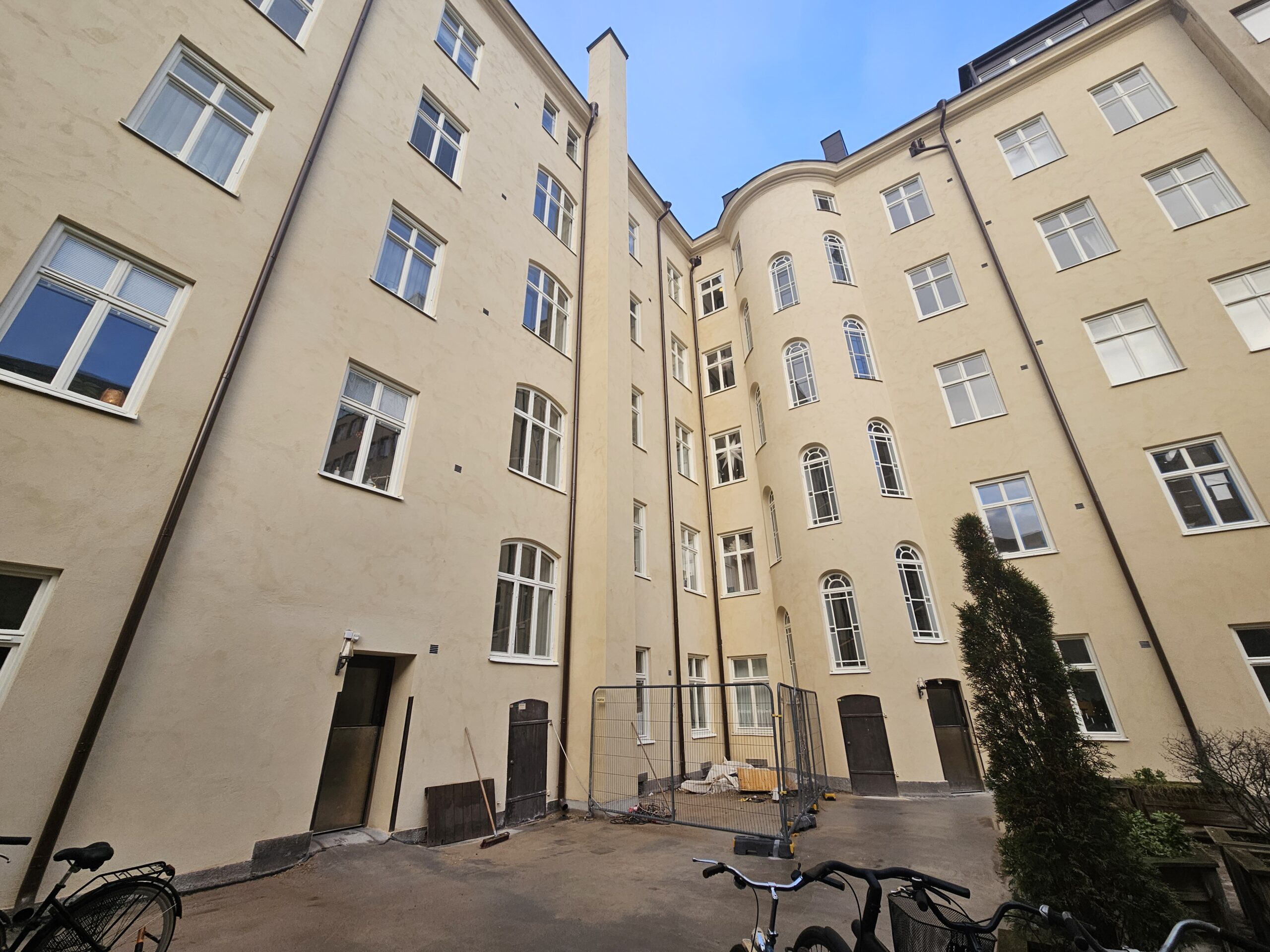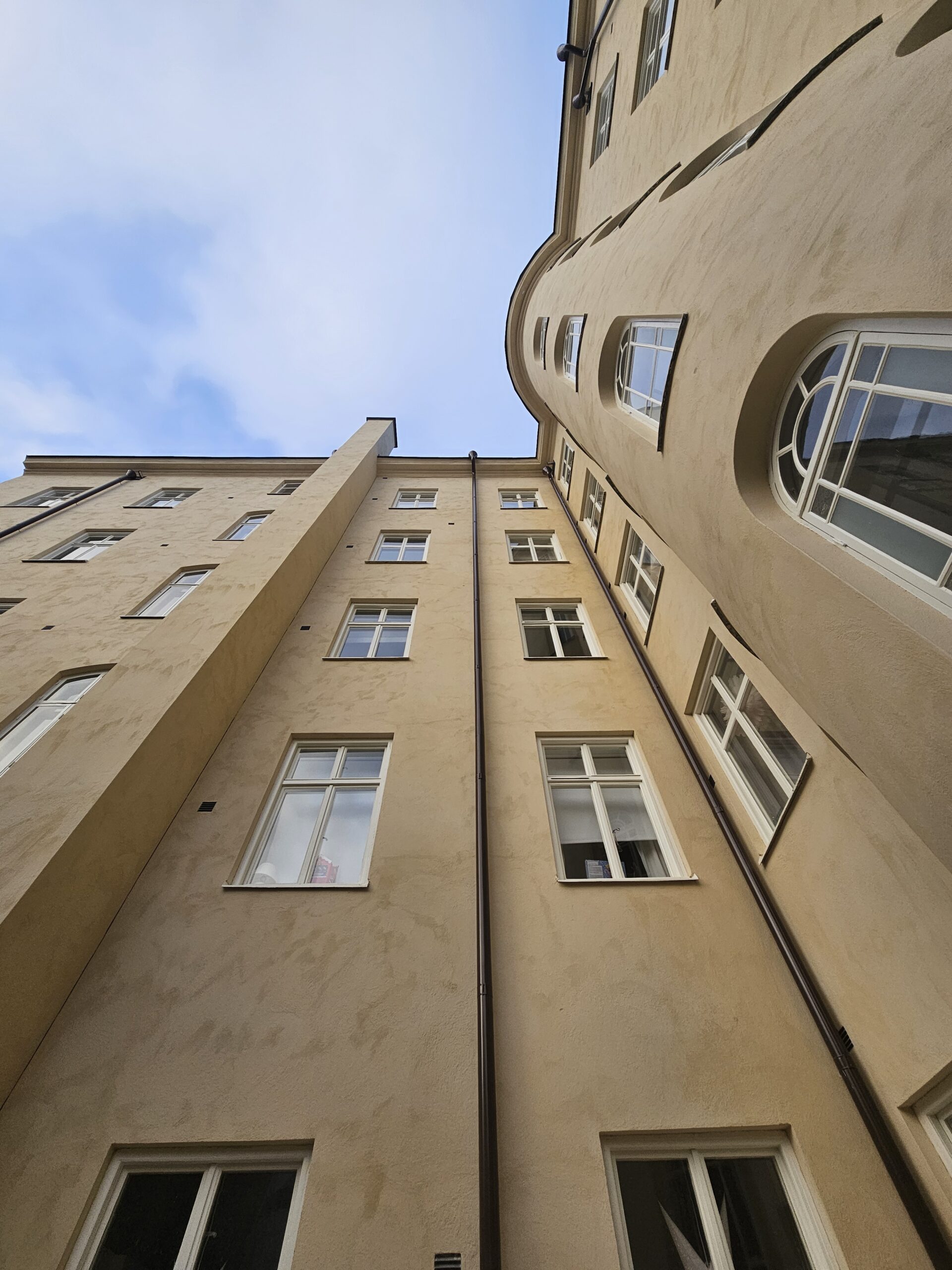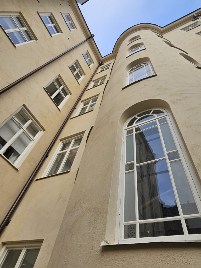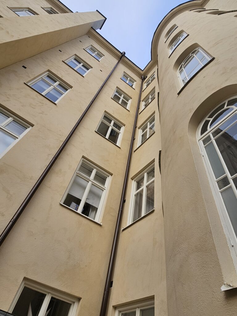 Fasderenovering, BRF i Stockholm. Nyputs av kalkbruksfasad.